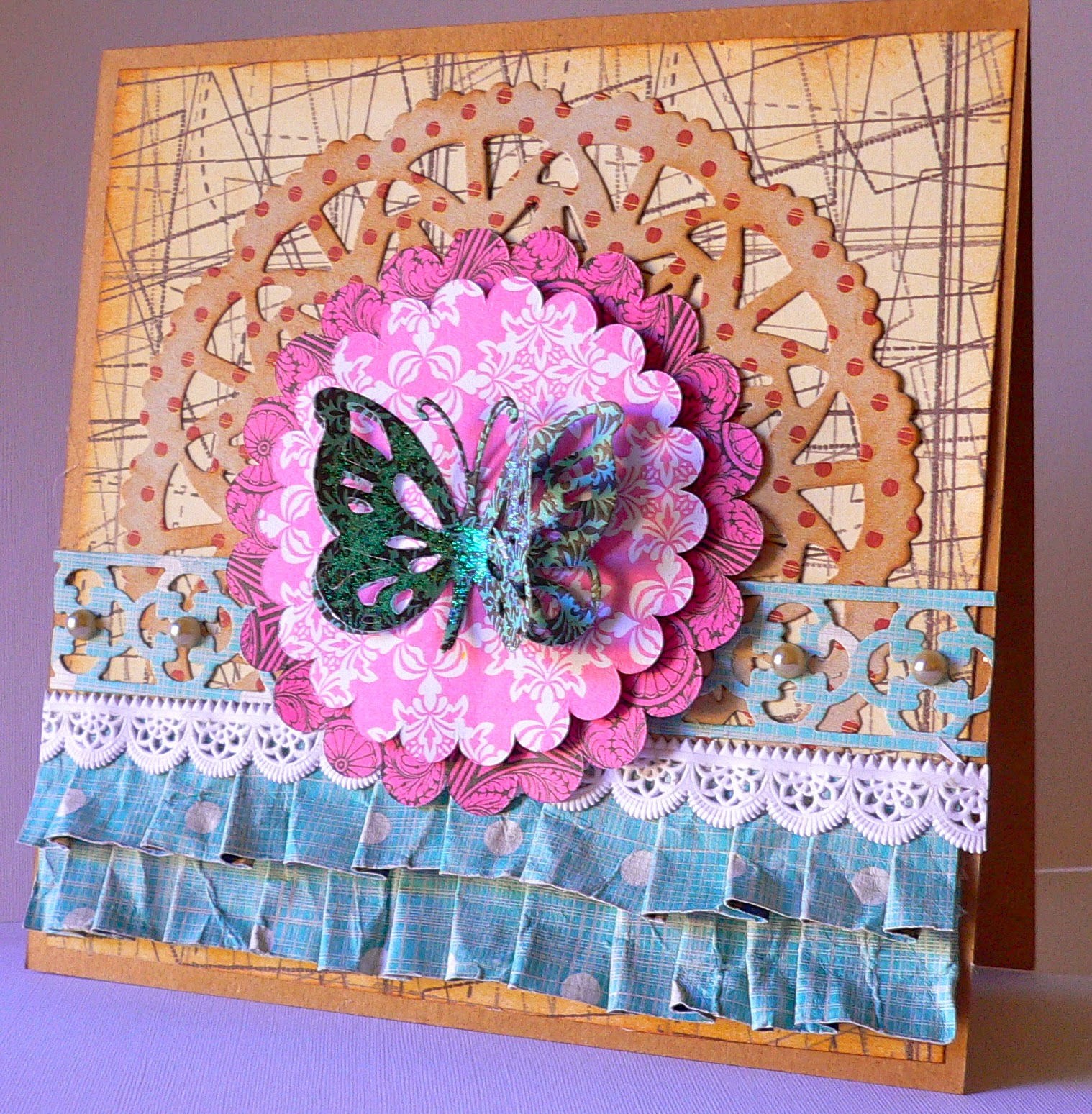 4. Adhere pleats and German white scrap lace border, on the bottom of card.