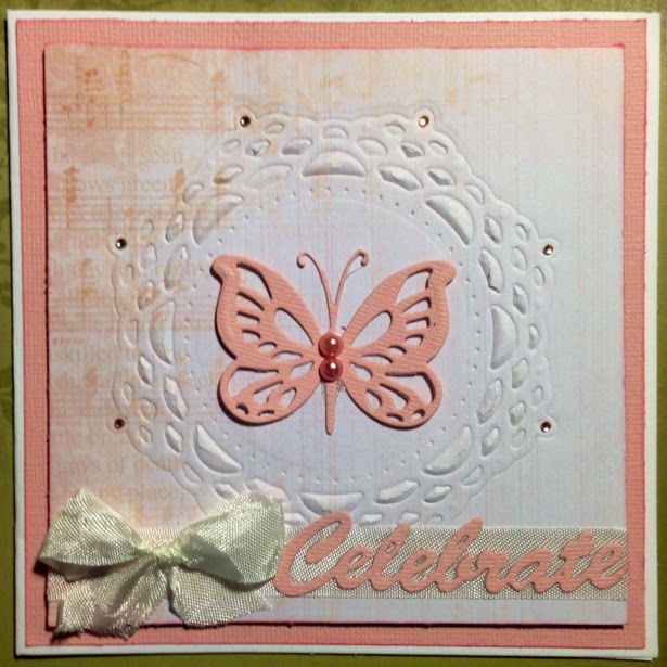 Mat and attach to a card base. Attach "Celebrate" die-cut, layered over Ultimate Crafts seam binding. Cut "Beautiful Butterfly" and embellish with some pearls and the gorgeous new Premium Adhesive Gemstones.