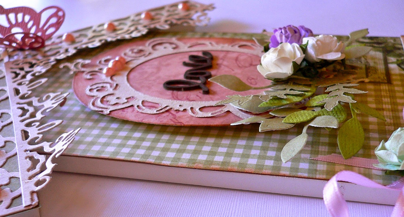 I cut one Oval Nesting Die with the Vintage Rose paper collection and using double side foam tape, place in the centre of the plaque.