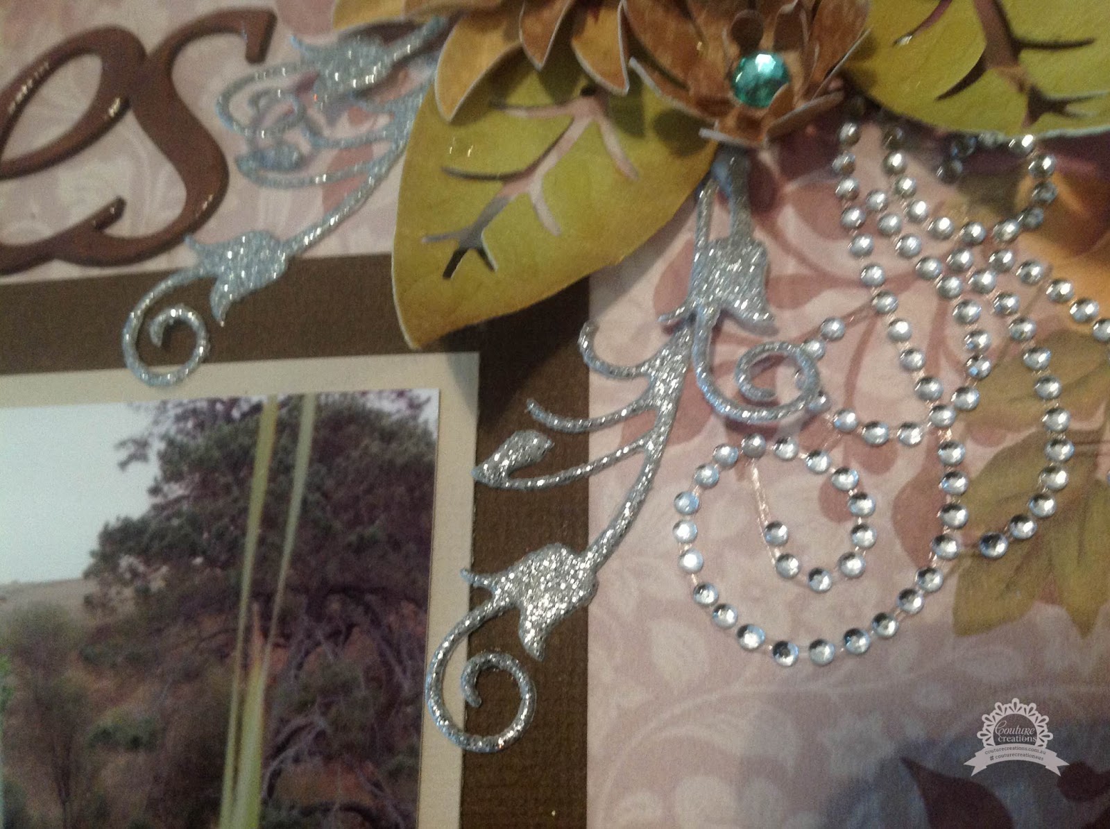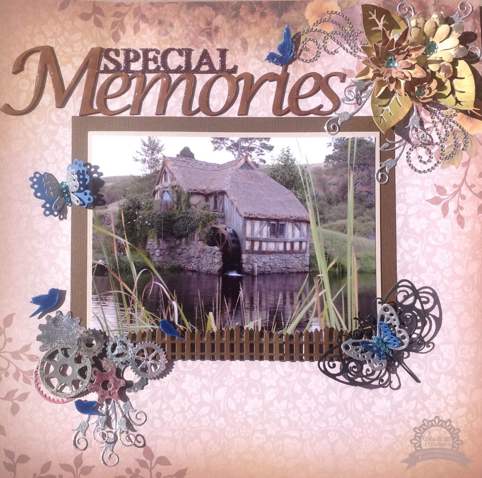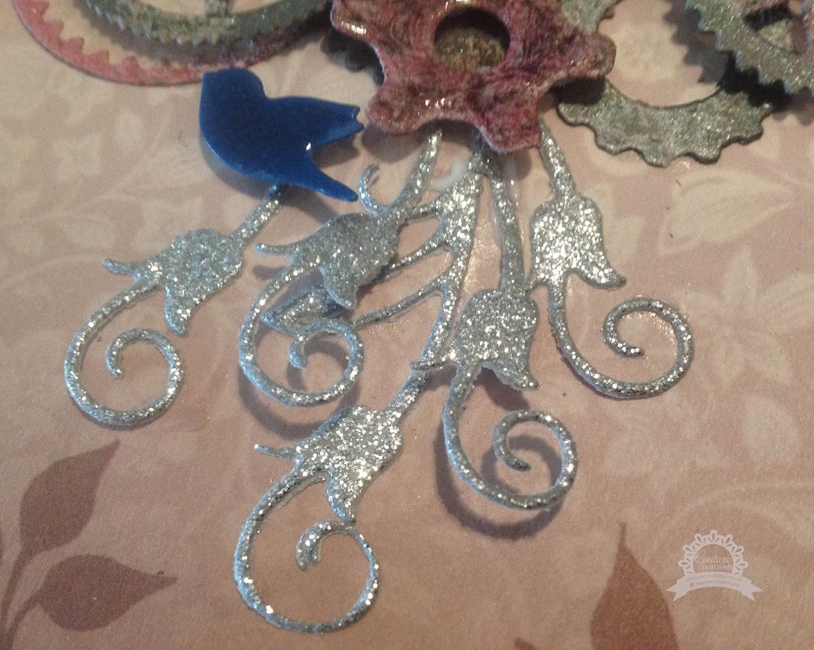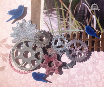 The Kalini Picket Fence, I cut 2 of these and raised them with small piece of foam tape, and placed it along the front of my photo, from the Secret Treasures collection, I cut a set of Bird Song die, placing them on the fence and around the gear cluster, topping the birds with Dimensional Magic