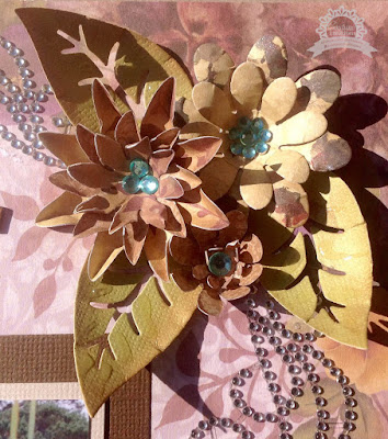 a set of the Kalini, Falling Blossom's, Layer each set using the Turbo Glue Pen, once dry, spritz with water and bend or pinch each petal to get 3 different looking flowers from the same die, add a touch of bling to the centers using Seaspray Gemstones