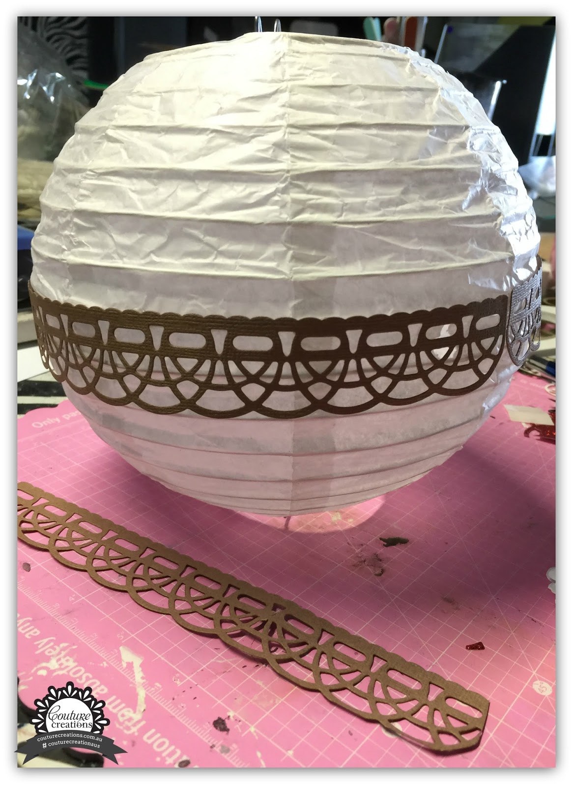 They come in many sizes and colours - I chose a small white one (20cms) to match my flowers.Measure around the circumference of your lantern and cut the required lengths of of the scalloped border die (Simone's Style) from the Amaryllis collection. (I used 3 lengths - 2 full lengths with a small section so they met. I've used this die several times - it's so versatile & a great addition to any die collection.