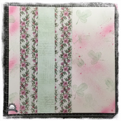 As the spritz was drying I cut a 6" x 12" piece of the Pretty Patches patterned paper and a 2" x 12" Rosehip Memories patterned paper from the Magnolia Lane collection. I distressed the edges of the patterned papers and then attached the Pretty Patches paper in from the left side about 1 1/2" and then centred the Rosehip Memories strip down the middle of the Pretty Patches paper.