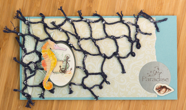 The seahorses were fussy cut and layered onto the side of the anchor oval from the Adhesive Chipboard pack and then nestled into the netting to finish off my card.